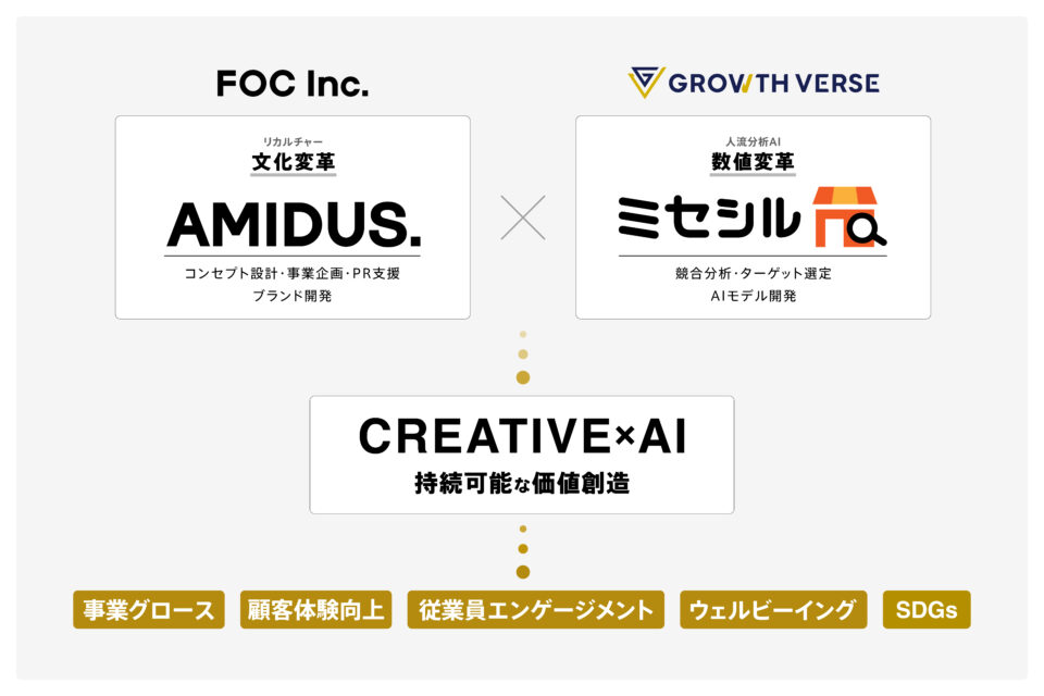 FOC株式会社(本社:東京都渋谷区、代表取締役社長:岡田 喜則、以下「FOC」)株式会社GROWTH VERSE(本社:東京都港区、代表取締役会長 兼 CTO 南野 充則、代表取締役社長 兼 CEO 渡部 知博)は、この度、クリエイティブとAIを組み合わせた新しいソリューションの提供を目的とした業務提携を開始したことをお知らせします。